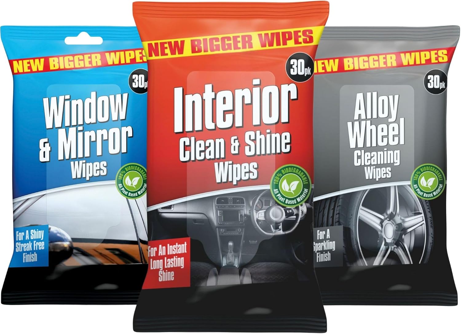 - 90 wipes total—30 each for windows/mirrors, interior/dashboard, and alloy wheels